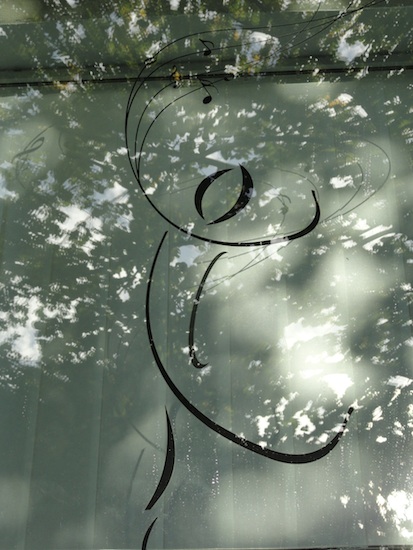 Les murs rideaux du Hall d’entrée vitré sont sérigraphiés de personnages dansant avec des bouquets de notes et partitions.